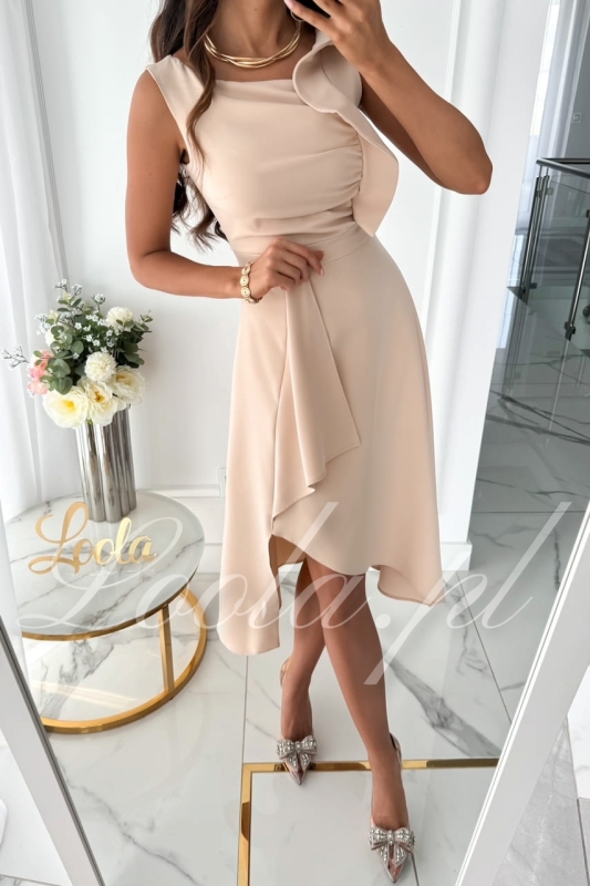 TRUE - beżowa ołówkowa sukienka na wesele z falbankami