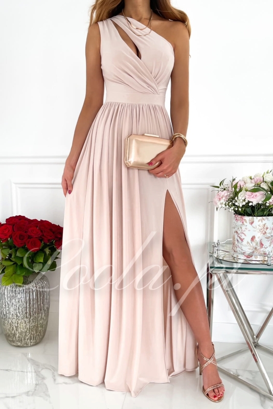 SALMA beżowa - Ołówkowa, sukienka na jedno ramię