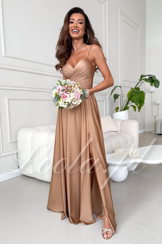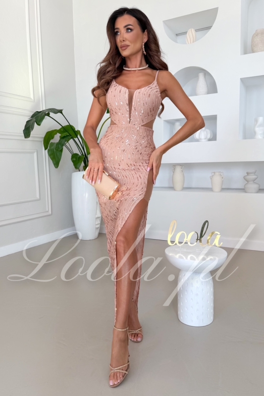 PERSEPHONA - beżowa sukienka midi z długim rękawem i wycięciami