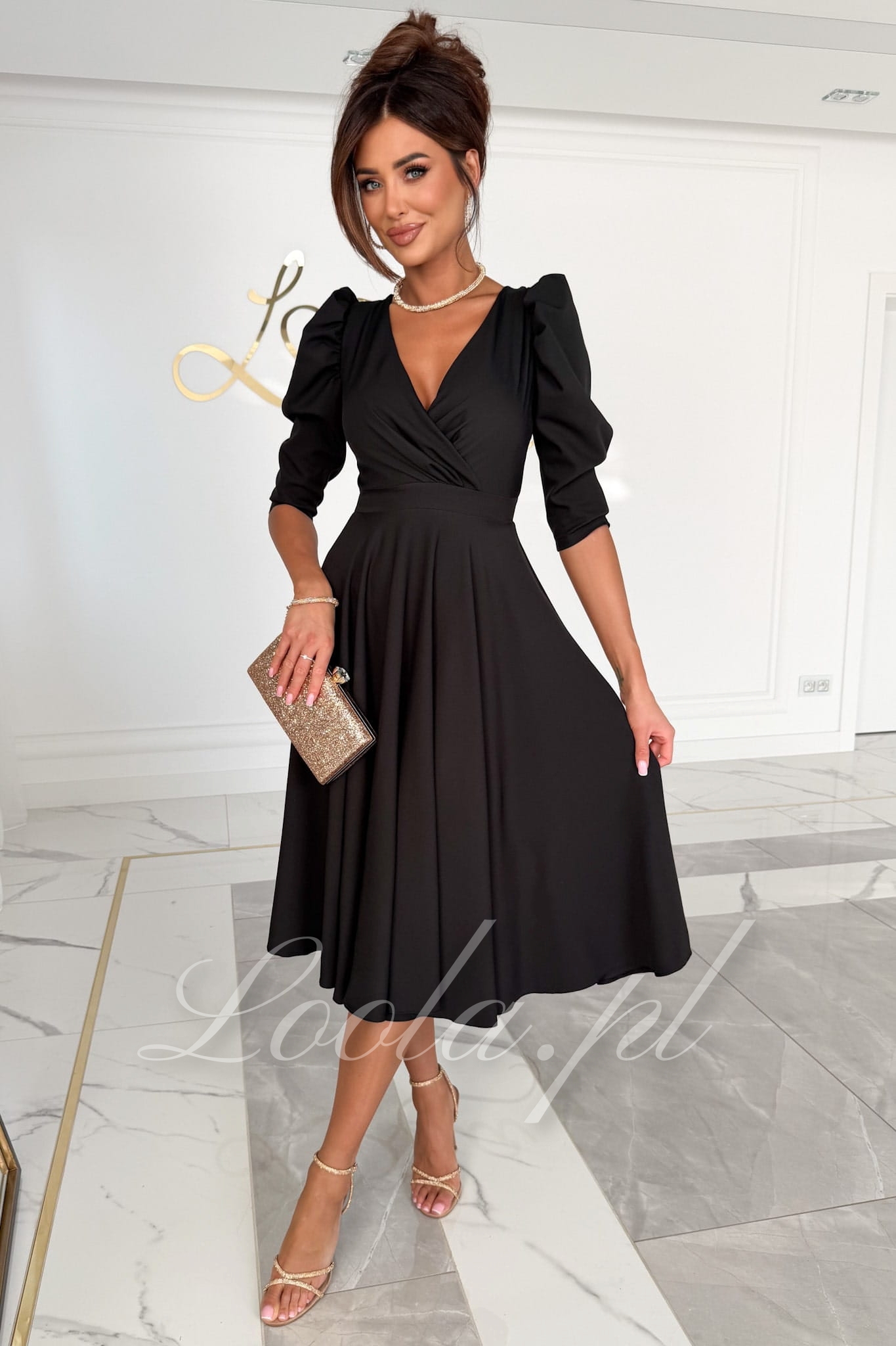 ALIKA - czarna rozkloszowana sukienka midi z bufkami