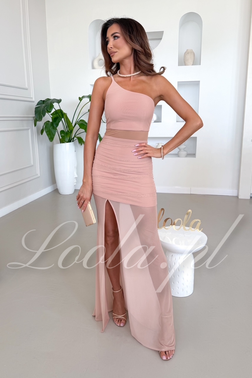 ALVORA - beżowa długa sukienka na wesele na jedno ramię