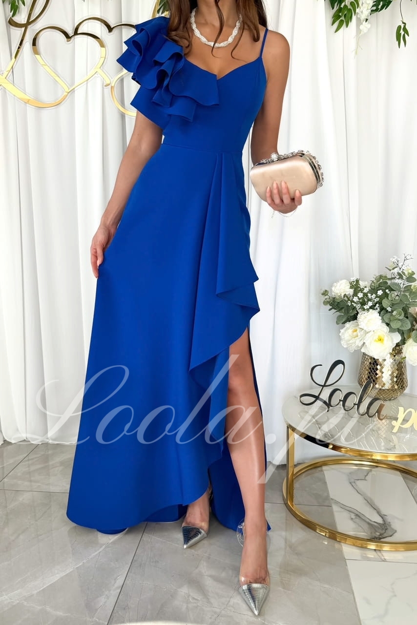 Niezwykle efektowna i bardzo elegancka sukienka Ballea będzie idealnym wyborem na wesele i inne wyjątkowe uroczystości. Rozporek na lewej nodze połączony z falbaną na spódnicy nadaje sukience subtelnego, zmysłowego charakteru, jednocześnie dodając lekkości i swobody ruchom. Lewe ramiączko jest regulowane, a na prawym znajduje się bogata podwójna falbana, która sprawia że sukienka emanuje luksusem i szykiem. Sukienka posiada podszewkę i jest dopracowana w każdym calu.