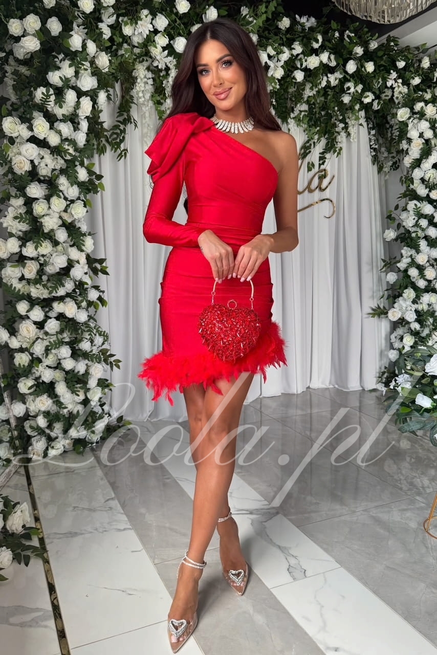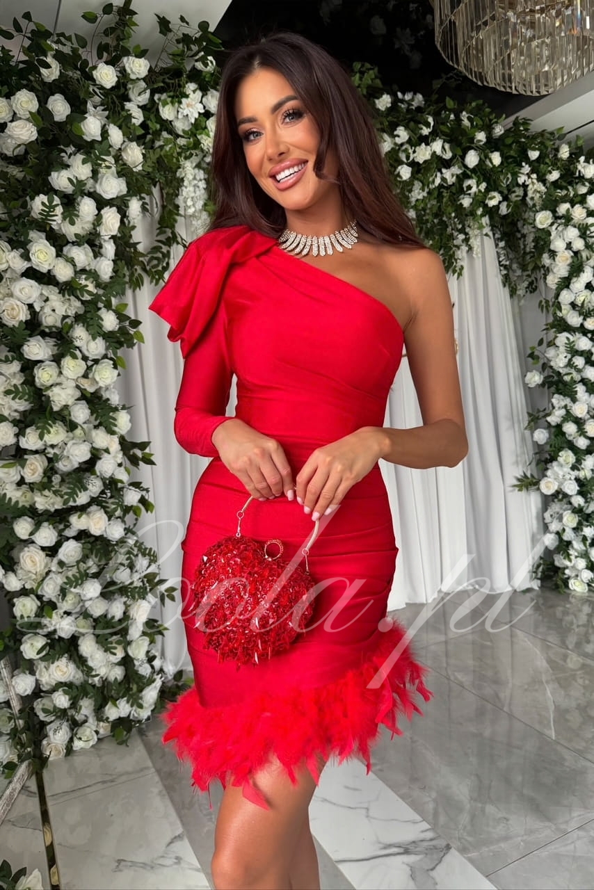 Zapraszamy do odkrycia naszej najnowszej propozycji - czerwonej krótkiej sukienki na jedno (prawe) ramię, która z pewnością stanie się gwiazdą Twojej garderoby. Ta wyjątkowa kreacja emanuje elegancją i oryginalnością, dzięki kilku unikalnym elementom, które ją wyróżniają. Sukienka posiada asymetryczną spódnicę wykończoną piórami, które dodają jej charakteru. To kreacja, która zrobi wrażenie zarówno na imprezach, jak i podczas bardziej formalnych wydarzeń takich jak wesele. Uszyta z elastycznej, eleganckiej tkaniny z delikatnym połyskiem, sukienka zapewnia komfort noszenia i świetnie dopasowuje się do sylwetki, posiada również podszewkę. Marszczenia na spódnicy i w pasie dodają subtelnej kobiecości, podkreślając atuty figury.
