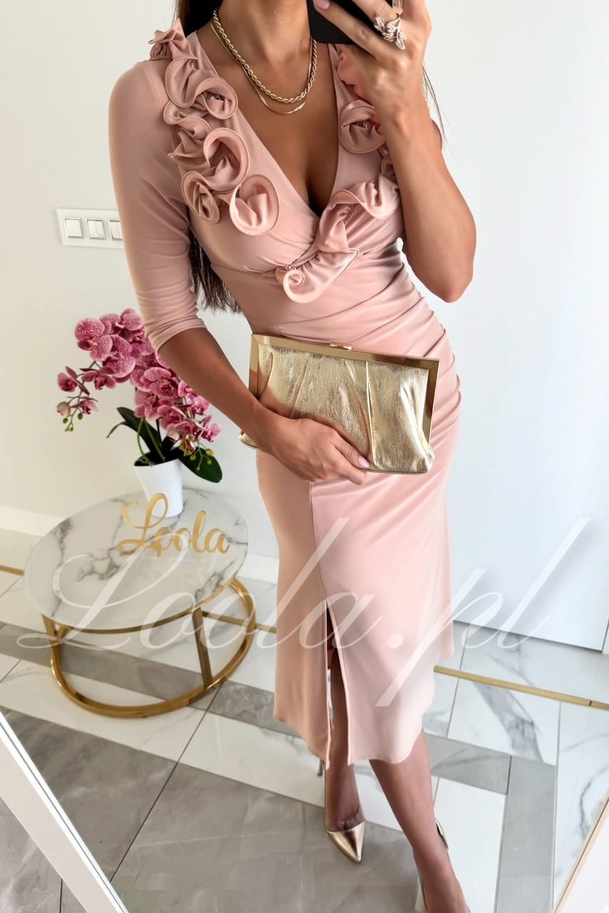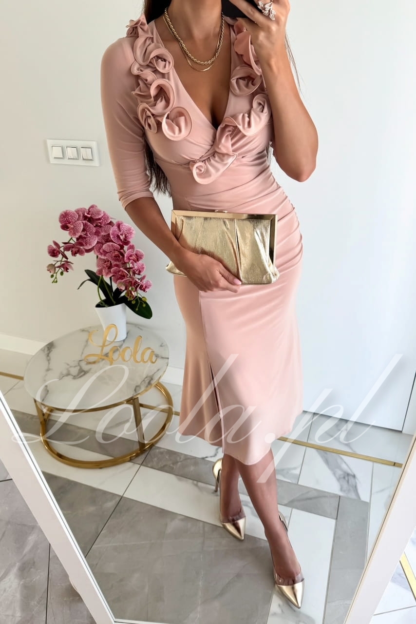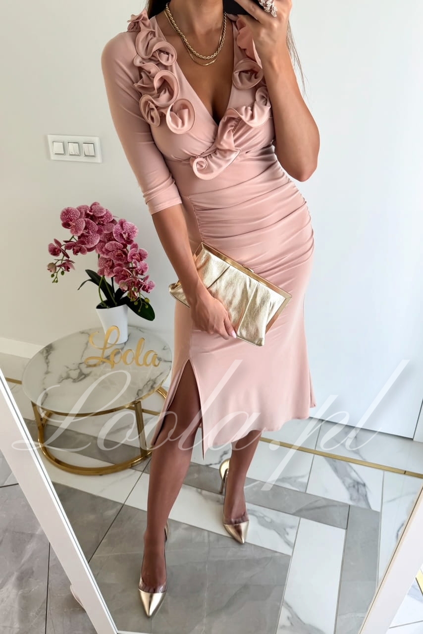 Elegancka, oryginalna sukienka z piękną, ozdobną falbanką w kształcie różyczek. Sukienka jest niezwykle wygodna i przyjemna w noszeniu, jest elastyczna i dopasowuje się do sylwetki. Rozszerzana spódniczka o długości midi, z rozcięciem na lewej nodze, kształtuje kobiecą sylwetkę i podkreśla pośladki. Ten model posiada rękawy o długości 3/4, które świetnie sprawdzą również na przyjęcia o chłodniejszych porach roku. To będzie świetny wybór na mniejsze i większe okazje takie jak święta, chrzest, komunia, wesele, czy imprezy firmowe.