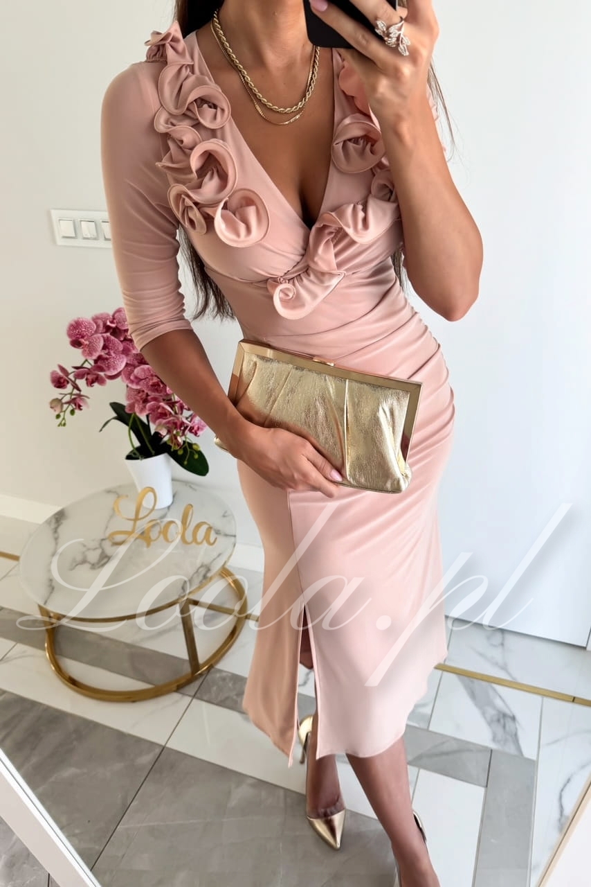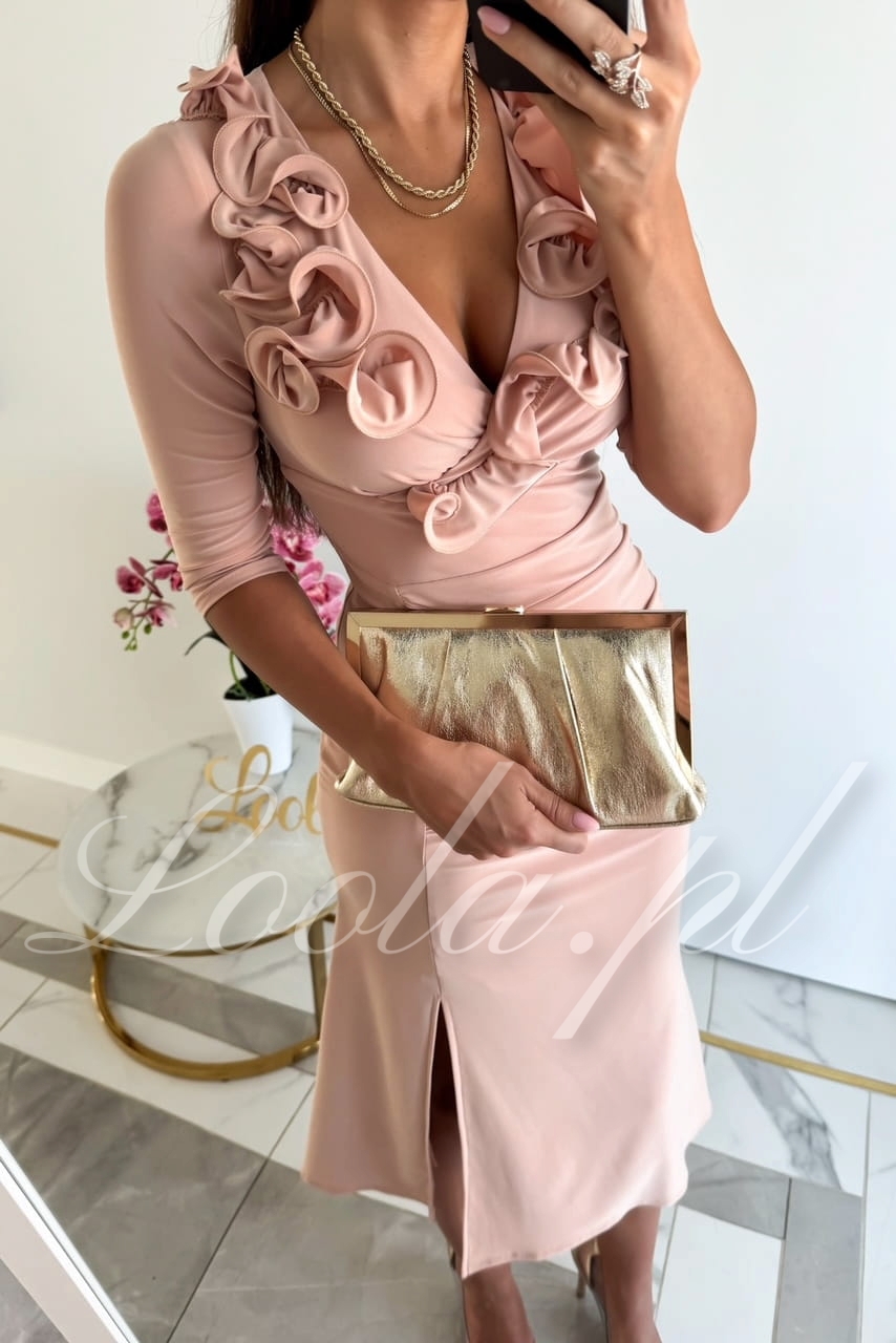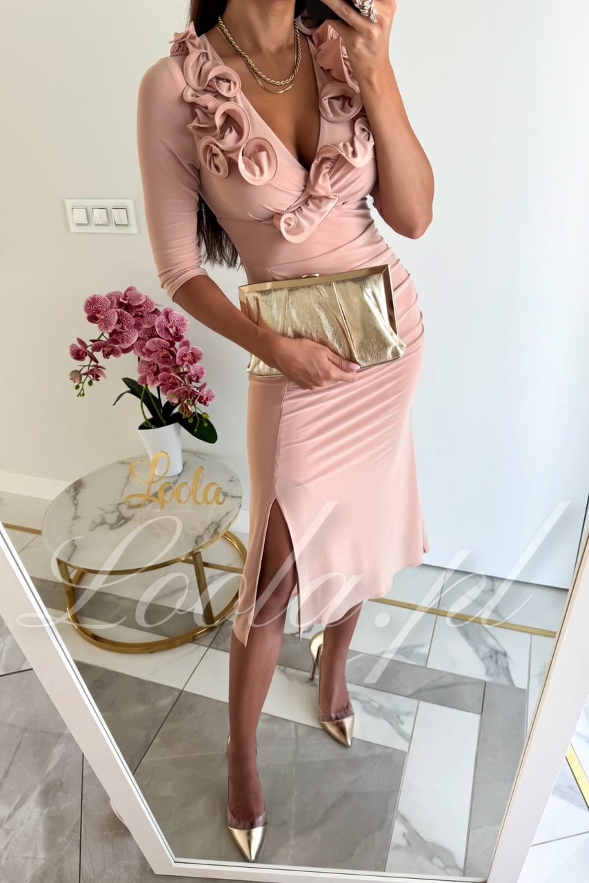Elegancka, oryginalna sukienka z piękną, ozdobną falbanką w kształcie różyczek. Sukienka jest niezwykle wygodna i przyjemna w noszeniu, jest elastyczna i dopasowuje się do sylwetki. Rozszerzana spódniczka o długości midi, z rozcięciem na lewej nodze, kształtuje kobiecą sylwetkę i podkreśla pośladki. Ten model posiada rękawy o długości 3/4, które świetnie sprawdzą również na przyjęcia o chłodniejszych porach roku. To będzie świetny wybór na mniejsze i większe okazje takie jak święta, chrzest, komunia, wesele, czy imprezy firmowe.