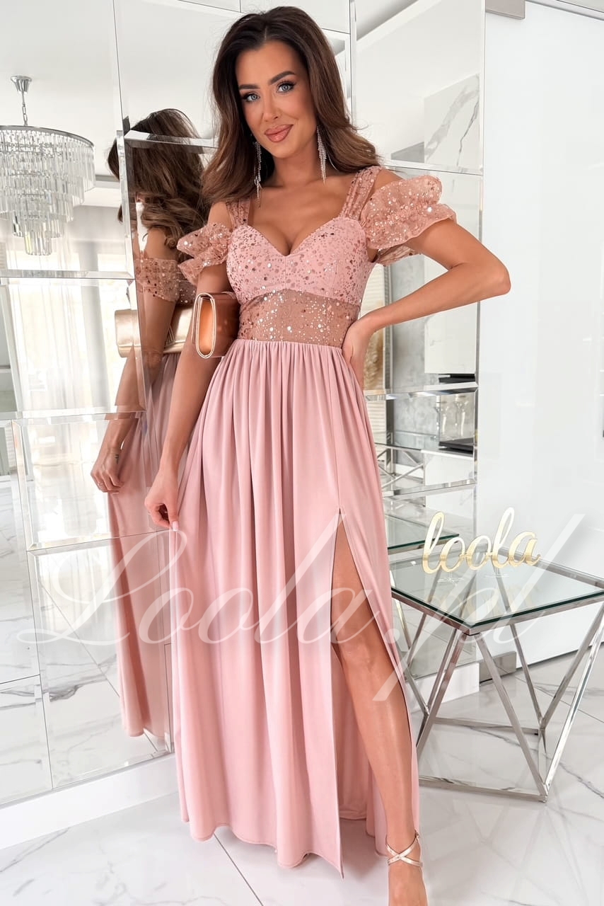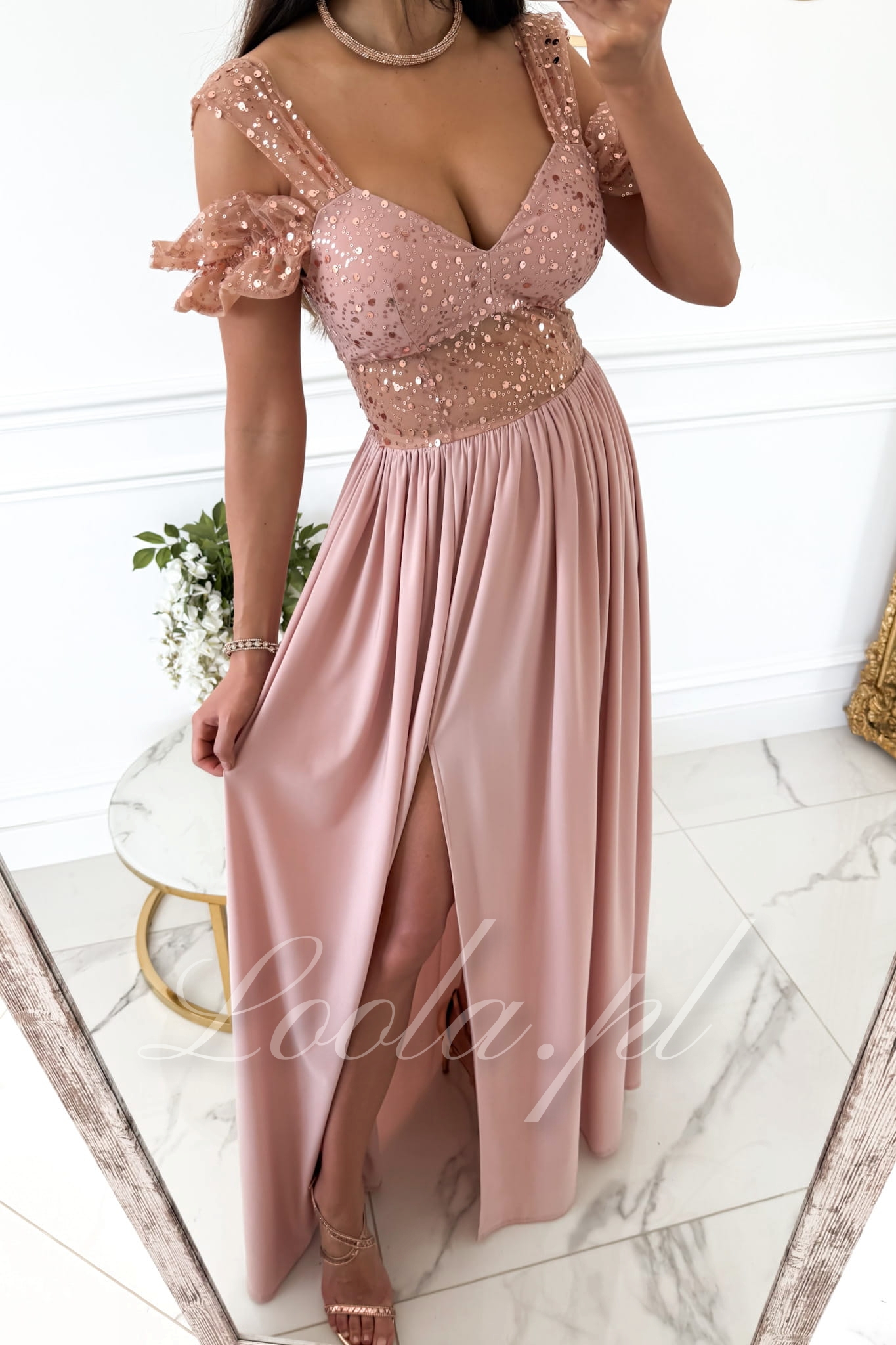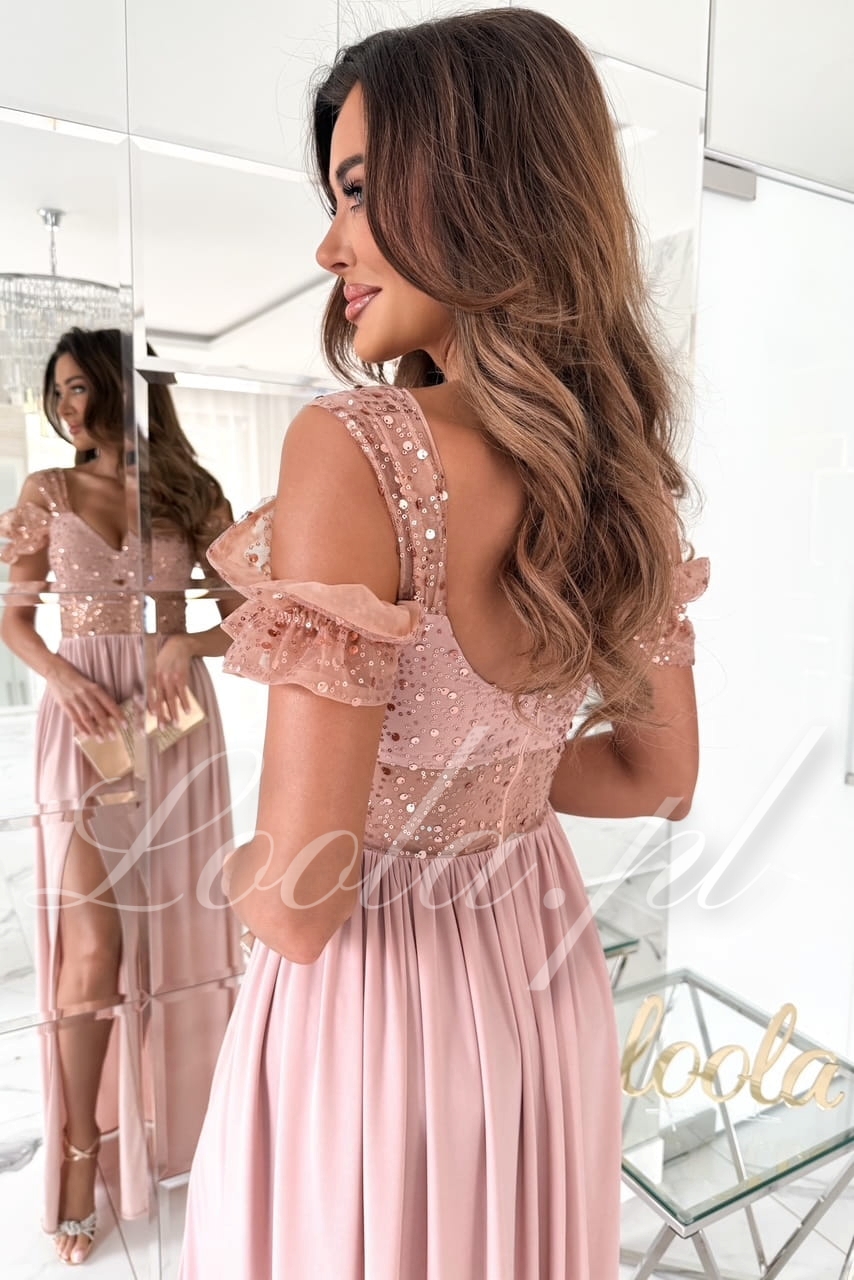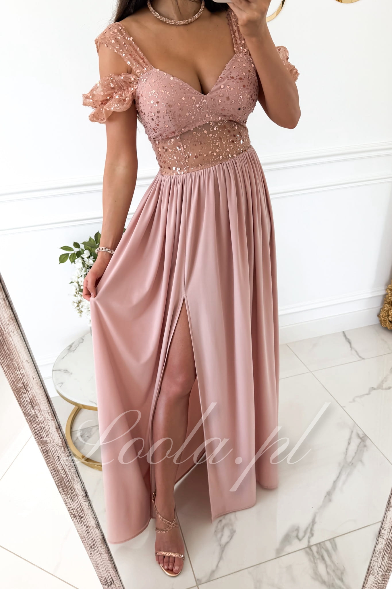 ISTRIA - beżowy róż cekinowa sukienka maxi z opadającymi ramiączkami