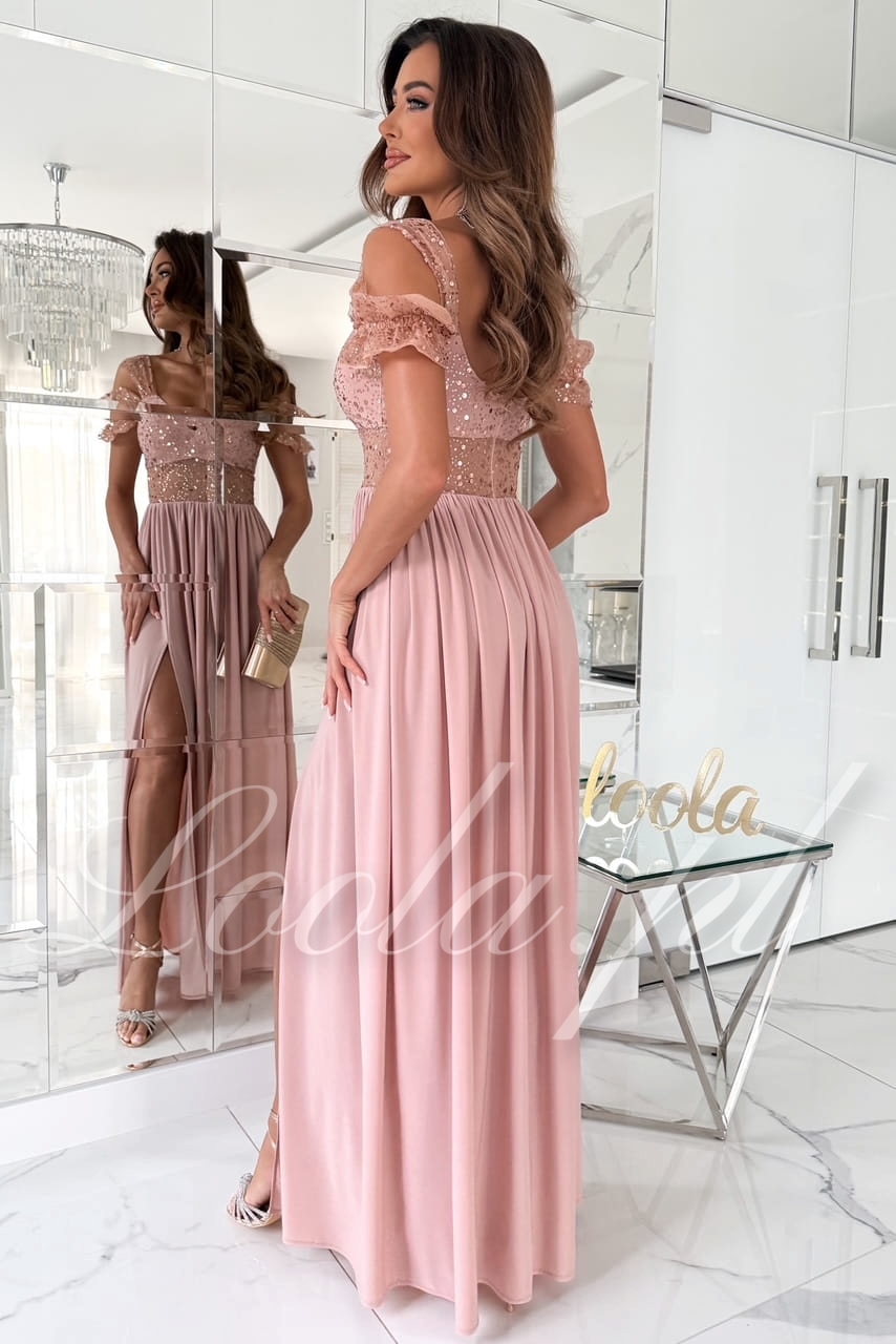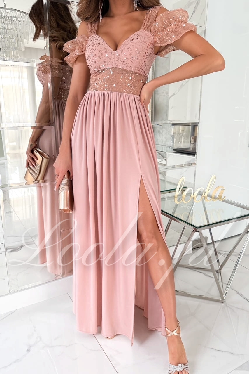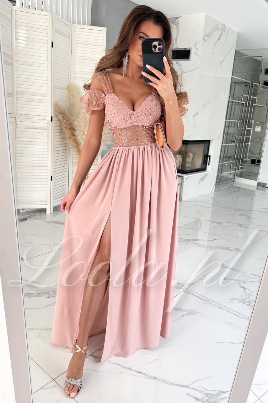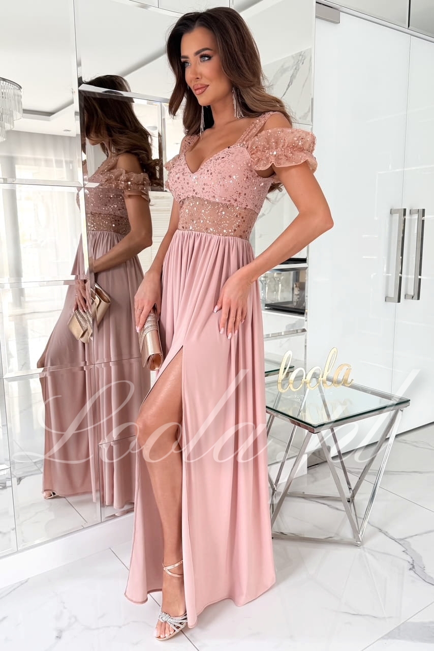 ISTRIA - beżowy róż cekinowa sukienka maxi z opadającymi ramiączkami