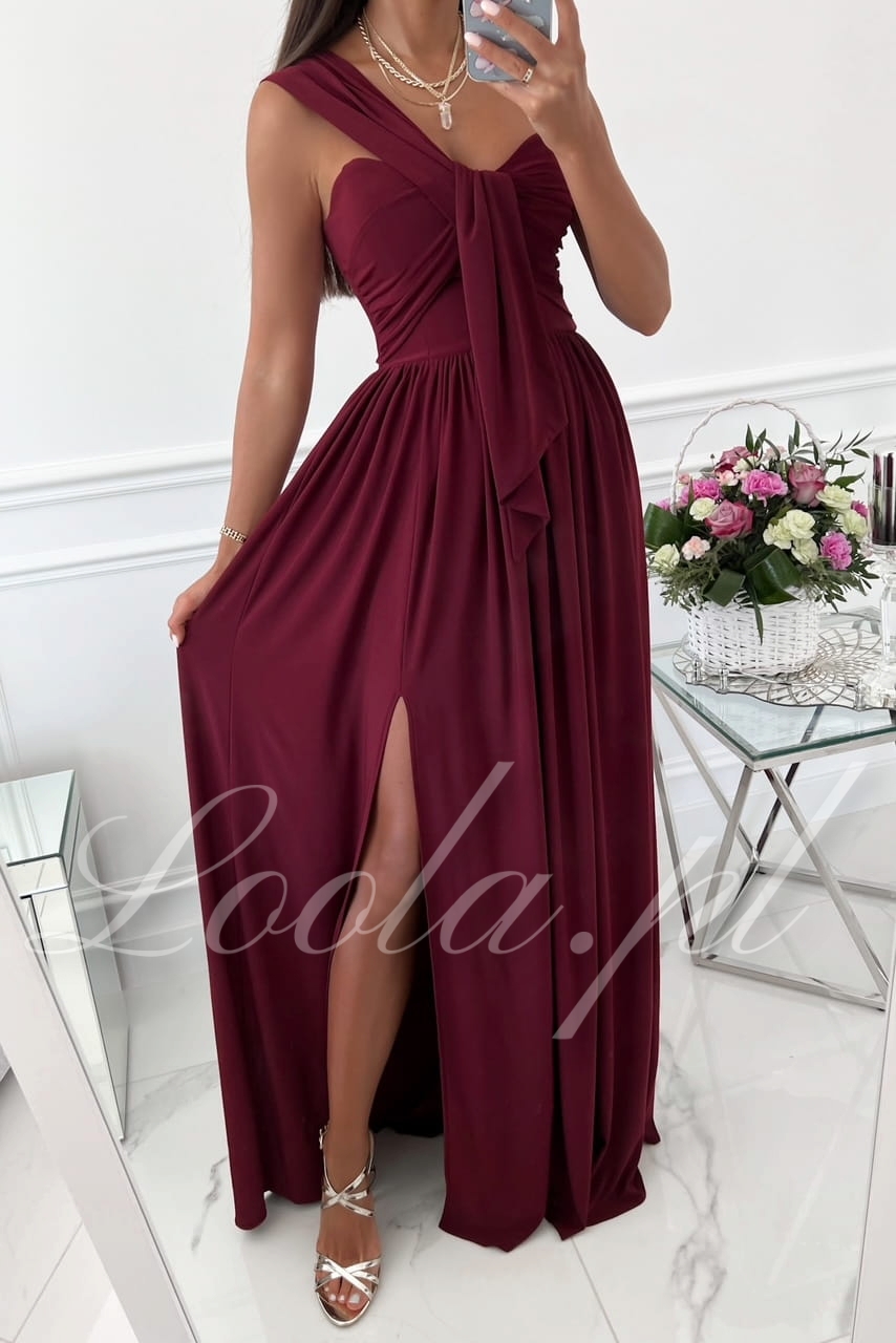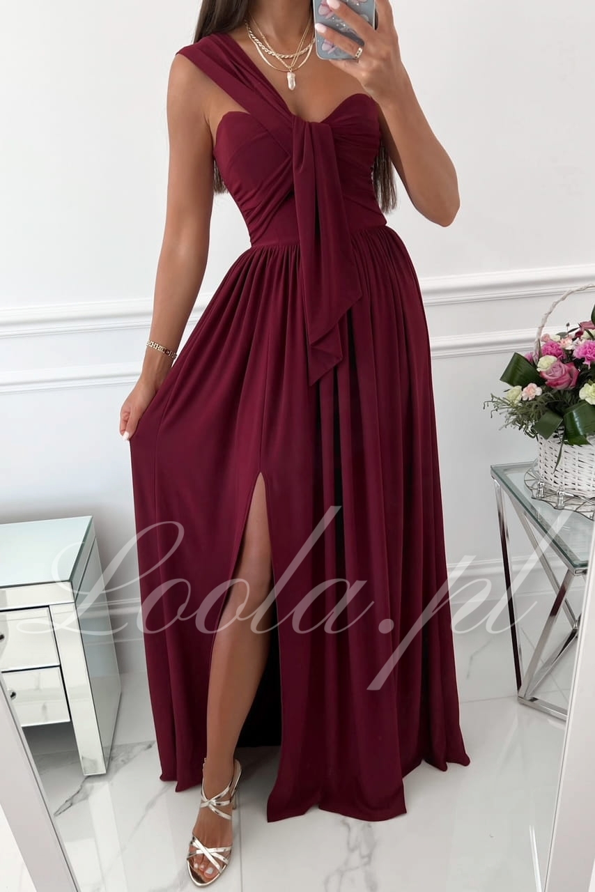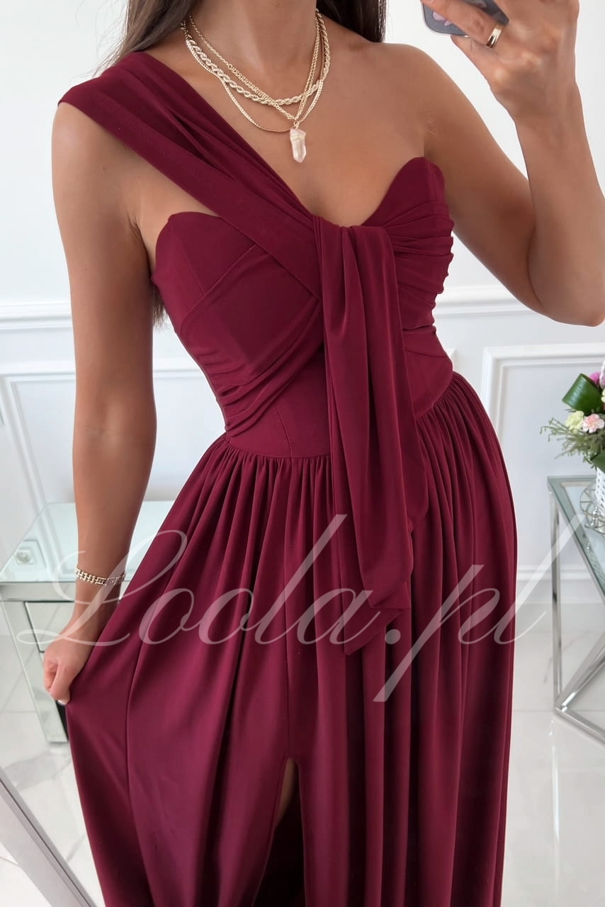 LUANA bordowa - Długa suknia z gorsetem i szarfą