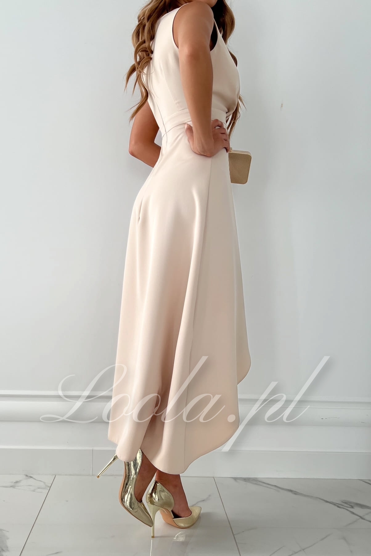 Liliel beżowa - Asymetryczna sukienka z falbanką i kopertowym dekoltem