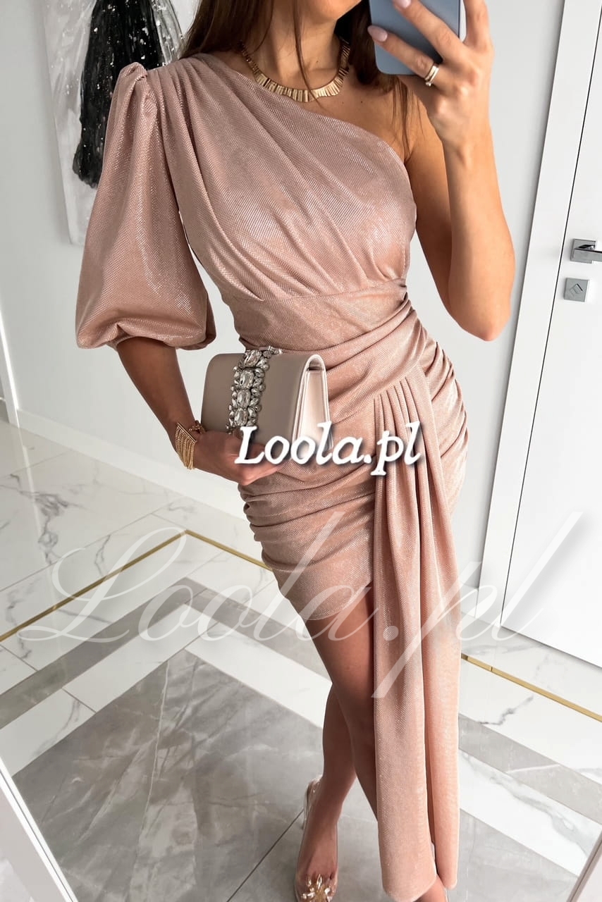 Jedyna w swoim rodzaju, asymetryczna sukienka o wyjątkowym kroju. Sukienka posiada marszczony, skośny dekolt z odkrytym prawym ramieniem oraz asymetryczną spódnicę, do której dodatkowo z prawego boku doszyta jest szarfa. Sukienka posiada liczne marszczenia, które świetnie maskują ewentualne niedoskonałości sylwetki. Kreacja została uszyta z połyskującej, elastycznej dzianiny, która dopasowuje się do sylwetki, nie ma brokatu. Poszukujesz kreacji na wesele, studniówkę lub sylwestra? Właśnie znalazłaś idealną kandydatkę na tę okazję. Fenomenalna propozycja na każdą imprezę!