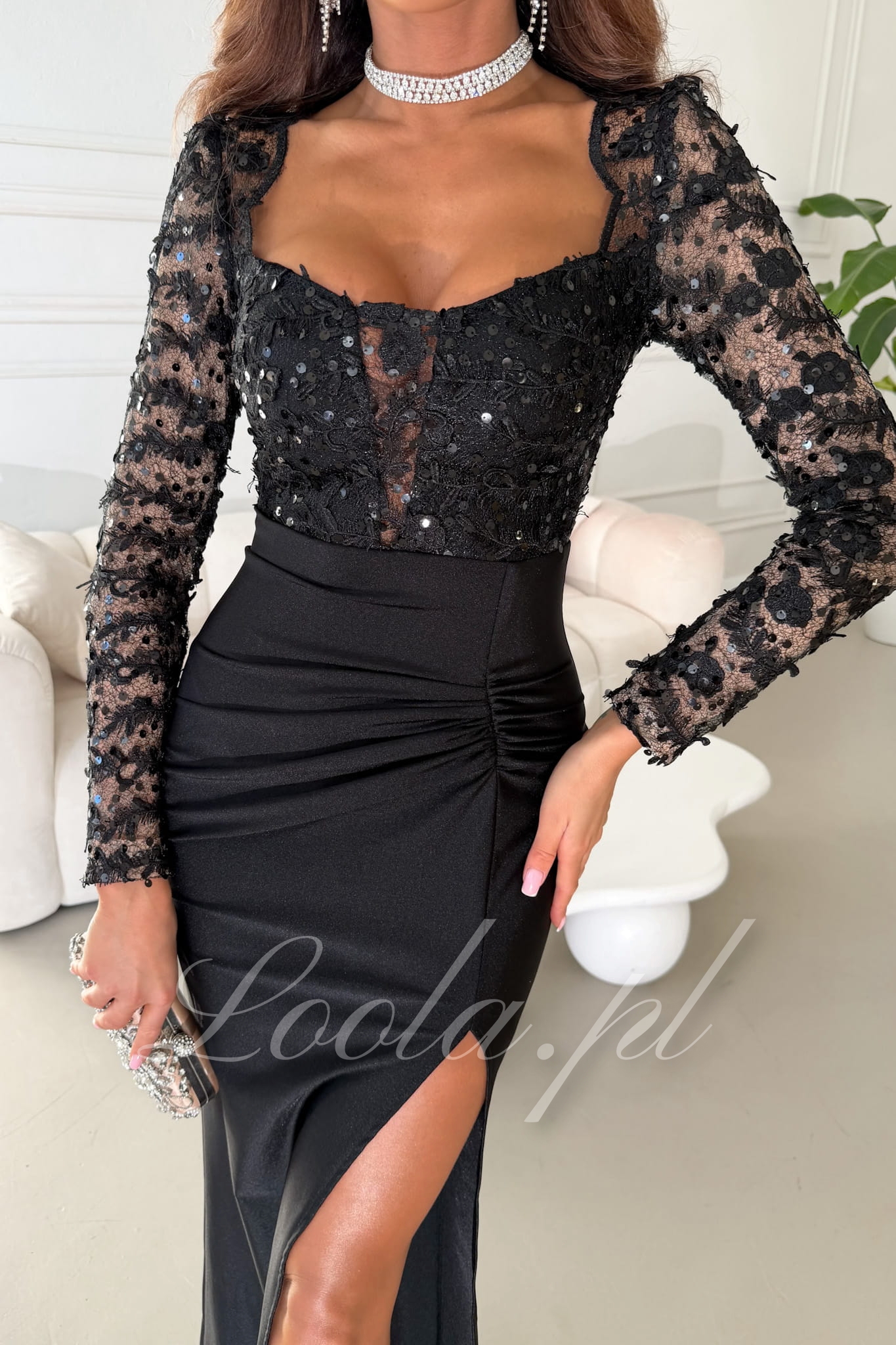 ROXANNE - czarna długa sukienka z koronkową górą z cekinami